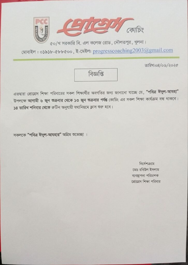 ‘পরিবর্তনের প্রয়াসে স্বপ্নময় অভিযাত্রায় প্রোগ্রেস কোচিং চলতে চায় তোমাদের নিয়ে। আশা করি সেই স্বপ্নময় অভিযাত্রায় তোমরাই হবে অভিযাত্রী, সম্ভাবনার আলোয় ডিঙাবে নিকষ কালো রাত্রি। শুধু স্বপ্ন দেখিয়ে আমরা থমকে যাবো, কখনোই না। আমরা চলবো অসীম সাহস, দৃঢ়তা, আন্তরিকতা, একাগ্রতা এবং দীপ্ত কঠিন মনোবল নিয়ে। তুমিও তোমার অস্থির তারুণ্যভরা মনকে খানিকটা স্থির করো, ভাবো, দেখো, বিবেচনা করো আমরা কতটুকু আন্তরিক, যত্নবান এবং প্রতিশ্রুতিশীল। তোমার জন্য সার্বক্ষণিক খোলা প্রোগ্রেস শিক্ষা পরিবারের স্বাপ্নিক দুয়ার।